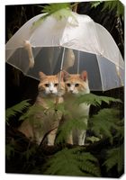 Obraz z serii wnętrza zatytułowany Podwójna Ochrona przedstawia dwie urocze, rude koty szukające schronienia pod przezroczystym parasolem, który zdaje się być koroną zielonej paproci. Ich symetryczne odbicie w połyskliwej strukturze parasola dodaje głębi i charakteru kompozycji. Ciepłe odcienie futra kotów kontrastują z ciemnym, zielonym tłem, co sprawia, że stają się centralnym punktem obrazu. Ich spojrzenia są skierowane prosto w obiektyw, co nadaje fotografii osobisty i intymny charakter. To zdjęcie idealnie uchwyciło moment spokoju i ochrony w naturalnym otoczeniu, a zarazem subtelnie podkreśla więź między dwoma zwierzętami. Idealne do wnętrz o domowym, ciepłym charakterze, zarówno dla miłośników kotów, jak i miłośników przyrody.