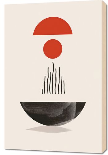 Obraz z serii boho zatytułowany Półokrągła Forma.Na tej grafike zmysłowe, geometryczne kształty tworzą obraz, który równie dobrze może być interpretacją wschodu słońca, jak i abstrakcyjnym przedstawieniem równowagi w przyrodzie. Półokrągła, czerwona forma nad czarną, pionową linią może sugerować słońce wschodzące nad cichym jeziorem, a czerwony krąg pośrodku może być metaforą istoty życia. Duża, ciemna forma na dole to ziemia lub możliwe odbicie, a całość kreuje uczucie pełni i harmonii.Plakat wprowadzi do wnętrza poczucie spokoju i wyważenia. Jest idealny dla tych, którzy chcą dodać do swojej przestrzeni element medytacyjny, pobudzający do refleksji. Doskonale pasuje do minimalistycznych salonów, biur, a także jako element zen w sypialniach, wprowadzając atmosferę oczyszczenia i wewnętrznej równowagi.