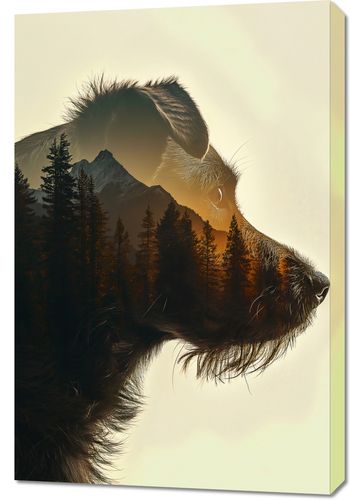 Obraz z serii natura zatytułowany Psi Duch Lasu ukazuje zjawiskowe połączenie sylwetki psa z krajobrazem górskim. Pięknie uchwycony profil psa, z jego czujnym spojrzeniem i delikatnymi liniami twarzy, płynnie przechodzi w malownicze góry, które wyłaniają się z jego sylwetki. Drzewa sosnowe i złociste światło zachodzącego słońca tworzą tło, które emanuje spokojem i harmonią. Kontur psa jest wyraźnie zarysowany, a jednocześnie subtelnie stapia się z przyrodą, co podkreśla nierozerwalną więź między zwierzętami a ich naturalnym środowiskiem. Ten obraz idealnie wpasuje się w wnętrza inspirowane naturą, w salonach miłośników zwierząt lub jako dekoracja w weterynaryjnych poczekalniach, przypominając o pięknie i sile natury oraz naszej odpowiedzialności za jej ochronę.
