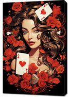 Obraz z serii abstrakcja zatytułowany Różany Hazard. Ta bogato zdobiona grafika przedstawia portret kobiety z królewskim spokojem, otoczoną przez wirujące karty z sercami i rozkwitające czerwone róże. Jej włosy płynnie przechodzą w kwiatowe motywy, a spojrzenie jest pełne tajemnicy i uroku. Motyle i drobne perełki dodają kompozycji element fantazji i delikatności. Wszystko to na tle głębokiej czerni, która eksponuje intensywność kolorów i detali. Obraz ten jest idealny dla przestrzeni, które chcą dodać element romantyzmu i wyrafinowania, jak eleganckie sypialnie, prywatne kolekcje czy luksusowe salony. Jego barwna paleta i symboliczne elementy sprawiają, że jest to dzieło, które przyciąga wzrok i pobudza wyobraźnię. BLEJTRAMABlejtrama, na którą naciągane jest płótno, wykonana jest z naturalnego drewna sosnowego. To mocne i solidne drewno stanowi jedno z najbardziej ekologicznych rozwiązań, gdyż jest łatwe w obróbce. Dodatkowym atutem jest fakt, że sosna rośnie w Polsce, co gwarantuje lokalną obróbkę materiału. Obraz na takiej blejtramie jest trwały i wytrzymały. Ramki do zdjęć nie są wliczone w cenę wydruku. Jeśli chcesz je nabyć, prosimy o dokonanie zakupu oddzielnie.ZADRUKOWANE BOKIKażdy egzemplarz charakteryzuje się zadrukowanymi bokami, co umożliwia zawieszenie obrazu na ścianie bez potrzeby dodatkowej oprawy.