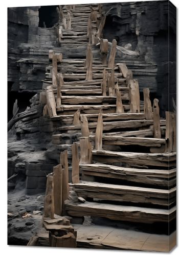 Obraz z serii pejzaże zatytułowany Schody do Nieznanego. Ten tajemniczy i intrygujący obraz przedstawia prymitywne, drewniane schody prowadzące w górę przez strukturę przypominającą starożytną ruiny lub naturalne formacje skalne. Zanurzone w półmroku, schody te wydają się zapraszać odkrywców do podjęcia podróży w nieznane, pełnej nieoczekiwanych odkryć. Obraz ten idealnie oddaje uczucie odkrycia i przygody, idealny dla przestrzeni zainspirowanych historią, naturą, czy literaturą eksploracyjną. Może stanowić inspirujący element w domach, biurach, a także w przestrzeniach publicznych takich jak kawiarnie tematyczne lub księgarnie.
