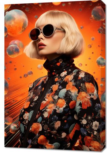 Obraz z serii pop art zatytułowany Słoneczny Akcent. Ten ekscytujący obraz łączy w sobie klasykę mody z elementami astrologii, prezentując postać kobiety w eleganckich okularach przeciwsłonecznych i kurtce w kwiatowy wzór. Tło w intensywnych odcieniach pomarańczy i czerwieni, z graficznymi przedstawieniami planet, nadaje kompozycji kosmiczną atmosferę. Modny bob i minimalistyczne okulary stanowią nowoczesny akcent, który w połączeniu z odważnym tłem tworzy wyjątkową wizję. Obraz jest idealny dla przestrzeni, które pragną wprowadzić modną, a jednocześnie kosmiczną atmosferę – doskonały do nowatorskich salonów, pracowni mody lub jako wyrazisty element dekoracyjny w prywatnych domach miłośników designu.