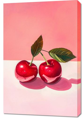 Obraz z serii wnętrza zatytułowany Soczyste Oczywiste ukazuje dwa soczyste, lśniące wiśnie z dwoma zielonymi liśćmi, które są połączone w jedną gałązkę, na pastelowym różowym tle z białą powierzchnią, na której odbijają się owoce. Wiśnie są przedstawione w realistycznym stylu, z widocznymi refleksami światła i kroplami wody, co nadaje im świeży i apetyczny wygląd. Zastosowanie cieni i światłocienia nadaje kompozycji głębi i trójwymiarowości. Dominujące ciepłe odcienie różu i czerwieni tworzą przyjemną i słodką atmosferę. Obraz może być interpretowany jako celebracja lata i dojrzałych owoców lub jako minimalistyczne podejście do tematu natury morte w nowoczesnym wydaniu. Idealnie nadawałby się jako element dekoracyjny do kuchni lub jadalni, wprowadzając żywy i kolorowy akcent.