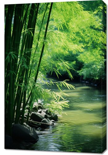 Obraz z serii natura zatytułowany Spokój Bambusów. Ukazuje on idylliczny zakątek przyrody, gdzie zielone pędy bambusa delikatnie zginają się nad błogim, spokojnie płynącym strumieniem. Gra światła i cienia na liściach bambusa tworzy wrażenie głębi i spokoju, zaś szemrząca woda dodaje uczucie świeżości i czystości. Ten obraz oddaje piękno i spokój odosobnionego zakątka natury, jest więc idealny dla przestrzeni relaksacyjnych takich jak spa, pokoje do medytacji lub jako ukojenie w zgiełku codzienności w domowych wnętrzach. To doskonała dekoracja dla tych, którzy pragną wprowadzić element natury i harmonii do swojego otoczenia.