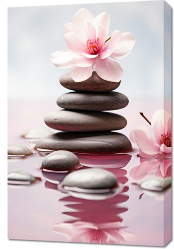 Obraz z serii natura zatytułowany Spokojne Odbicie. Delikatność różowego kwiatu doskonale kontrastuje z ciemnymi, gładkimi kamieniami, tworząc obraz pełen równowagi i spokoju. Lustro wody odbija symetrię kwiatu, podkreślając jego subtelność i kruchść, jednocześnie oddając uczucie głębi. Delikatne tło dodaje eteryczności i lekkości kompozycji. Ten relaksujący i wyciszający obraz doskonale sprawdzi się w spa, gabinetach masażu oraz w pomieszczeniach medytacyjnych, gdzie panować ma atmosfera spokoju i harmonii.
