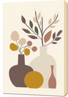 Obraz z serii minimalistyczne zatytułowany Stonowane Naturmorta. Artystyczne przedstawienie klasycznego naturmorta ożywione zostało poprzez minimalistyczne kształty i spokojną paletę barw. Butelki i wazy o prostych formach, wypełnione są stonowanymi okręgami i liśćmi, które przypominają delikatne kompozycje florystyczne. Barwy ziemi – od ciepłych beżów po głębokie brązy – są połączone z subtelnością, tworząc wyrafinowany i spokojny nastrój.Ten obraz doskonale wpisze się w dekorację nowoczesnych, stonowanych wnętrz, gdzie jego elegancja i subtelność mogą być w pełni docenione. Idealny do umieszczenia w salonie, sypialni lub biurze, doda każdemu z tych miejsc ciepła i domowej atmosfery, zachowując przy tym czystość i prostotę linii.