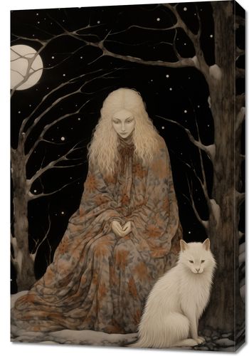 Obraz z serii wnętrza zatytułowany Stróżka Leśna. Ta eteryczna praca artystyczna ukazuje postać kobiecą, owiniętą w szatę z motywem leśnym, zatopioną w kontemplacji pod gałęziami drzew oplecionych przez śnieg i w blasku pełnego księżyca. Jej spokojna obecność i blady odcień skóry kontrastują z ciemnością nocy, a towarzyszący jej biały wilk dodaje elementu dzikości i tajemniczości. Obraz oddaje uczucie spokoju i jedności z naturą, a jednocześnie wzbudza ciekawość dotyczącą ukrytych opowieści i starych legend. Idealny dla miłośników fantastyki, mitologii, oraz tych, którzy pragną wprowadzić do swojego wnętrza elementy oniryczne i magiczne.