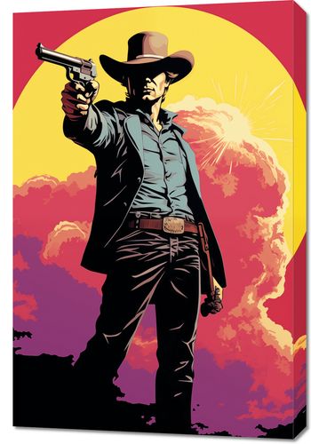 Obraz z serii pop art zatytułowany Strzelec z Epoki. Ten obraz przedstawia postać klasycznego kowboja w akcie wystrzału, z tłem wschodzącego słońca, które rozświetla scenę w ciepłych odcieniach czerwieni i pomarańczy. Silny kontrast i zdecydowane linie wydobywają charakterystyczne cechy postaci, od kapelusza po detale na szelkach i pasie. Obraz ten jest hołdem dla kultury westernów i bezkresnych amerykańskich przestrzeni, idealny dla miłośników historii i kinematografii, a także jako wyrazisty element dekoracyjny w miejscach takich jak domy, bary tematyczne lub sale kinowe.