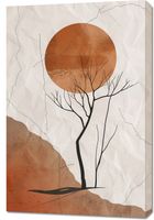 Obraz z serii minimalistyczne zatytułowany Surowość Pustyni to wizualne połączenie surowości pustyni z symboliczną prostotą. Na pierwszym planie widoczne są spękane, rudo-czerwone tereny, na których cienka, czarna sylwetka drzewa rzuca się w oczy swoim szkieletowym kształtem. Nad tym minimalistycznym krajobrazem unosi się duży, pełny krąg w tonacji rdzawej, sugerując gorące słońce lub wielki księżyc. Tło, z delikatnymi plamami i teksturą przypominającą pomarszczony papier, dodaje głębi i tekstury. Ten obraz to mieszanka prostoty i głębi, idealna dla przestrzeni ceniących spokój, równowagę i surowe piękno natury.