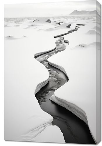 Obraz z kolekcji pejzaże zatytułowany Meandry Mrozu. Ten obraz przedstawia sinący lodowiec, którego szczeliny przecinają śnieżnobiałą powierzchnię, tworząc naturalne dzieło sztuki. Monochromatyczna paleta barw, gdzie biel śniegu kontrastuje z głębokim czerniami wód lodowcowych, przemawia do wyobraźni i wywołuje uczucie surowości oraz majestatu natury. Doskonały do wnętrz o minimalistycznym designie lub jako mocny wizualny akcent w przestrzeniach takich jak salony, biura i lobby hotelowe, gdzie może inspirować do refleksji nad pięknem i siłą przyrody.
