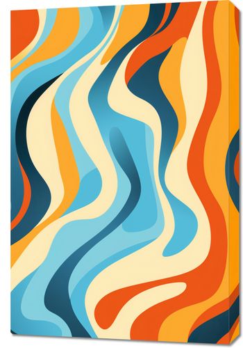 Obraz z serii abstrakcja zatytułowany Tańczące Fale. Kolorowe pasma falujące w rytmie niewidzialnej melodii, tworząc kalejdoskop błękitów, pomarańczy i beżów. Te meandryczne wzory przypominają wodne tanecznice, które wirowałyby w rytmie letniego brzasku. Ciepłe i chłodne tony kontrastują ze sobą, nadając obrazowi głębi i dynamiki. Będzie idealnym wyborem dla nowoczesnych apartamentów nad morzem, czy też kawiarni o śródziemnomorskim klimacie.
