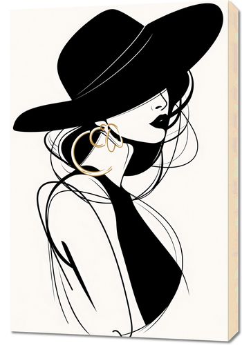 Obraz z serii minimalistyczne zatytułowany Uwikłana Elegancja. Grafika przedstawia sylwetkę tajemniczej, eleganckiej postaci w szerokim kapeluszu, co nadaje kompozycji aurę wyrafinowania i gracji. Stylizowany portret, wykonany czernią i bielą z akcentami złota, emanuje klasyką i nowoczesnością. Silny kontrast i płynne linie podkreślają zmysłowy kształt ujęcia oraz wytworność biżuterii, sugerując wyrafinowany gust i pewność siebie modelki. Obraz ten idealnie wpasuje się w eleganckie wnętrza, gdzie klasyka spotyka się z nowoczesnością, doskonale nadając się do salonów, sypialni, garderoby lub jako elegancki akcent w przestrzeniach komercyjnych, takich jak salony piękności czy butiki.