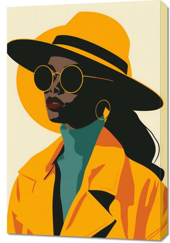 Obraz z serii abstrakcja zatytułowany Żółta Stylowość. Grafika ta portretuje postać kobiety w stylowym, żółtym kapeluszu i okularach przeciwsłonecznych, którego wyraziste linie i bloki kolorów tworzą silny, graficzny obraz. Odcienie żółci, połączone z subtelnymi akcentami zieleni i czerni, nadają kompozycji nowoczesnego i śmiałego charakteru. Postać emanuje pewnością siebie i wyrafinowaniem, co czyni ten obraz idealnym elementem dekoracyjnym dla przestrzeni o współczesnym designie, a także dla miejsca, które chce dodać akcent miejskiej elegancji. Idealny dla salonów modowych, gabinetów kosmetycznych czy nowoczesnych biur kreatywnych.