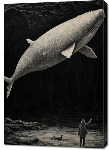 Obraz z serii abstrakcja zatytułowany Biały Wieloryb. Ta tajemnicza i prowokująca grafika przedstawia surrealistyczne spotkanie człowieka z ogromnym wielorybem w ciemnym, leśnym otoczeniu. Monochromatyczna paleta barw i szczegółowe tekstury nadają tej scenie wygląd ręcznej ilustracji. Wieloryb, unoszący się w powietrzu, stwarza wrażenie ciszy i spokoju, podczas gdy postać człowieka, zwrócona ku niemu, wprowadza element refleksji i głębokiej łączności z naturą. Obraz ten jest idealnym wyborem dla miłośników sztuki, którzy cenią sobie niestandardowe i głębokie przesłanie, doskonale nadaje się do osobistych przestrzeni medytacyjnych, nowoczesnych salonów, czy jako mocny akcent w galeriach sztuki.
