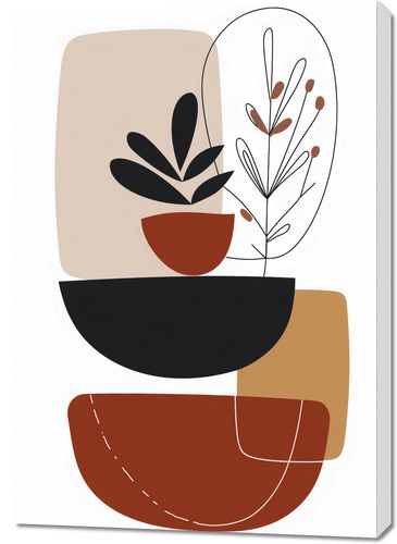 Obraz z serii minimalistyczne zatytułowany Botaniczna Abstrakcja. To artystyczne dzieło przedstawia stylizowane, botaniczne motywy ukryte wśród geometrycznych form. Delikatne rośliny w doniczkach uchwycone są w prostych, ale wyrafinowanych konturach, zaznaczających ich sylwetki na tle złożonego z ciepłych i neutralnych barw tła. Brązy i beże splatają się tu z głęboką czerwienią, tworząc organiczne poczucie natury uproszczonej do esencji formy. Ten obraz doskonale odnajdzie się w przestronnych, jasnych wnętrzach, gdzie natura spotyka się z minimalizmem - idealny do salonów w stylu skandynawskim, spokojnych gabinetów, lub jako ukojenie w dynamicznym, miejskim biurze.