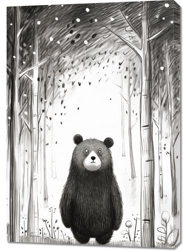 Obraz z serii wnętrza zatytułowany Ciekawski Miś. Ten uroczy obraz ilustracyjny przedstawia przyjaznego, czarno-białego misia stojącego na dwóch nogach w środku leśnej polany, patrzącego z ciekawością w górę na delikatnie opadające płatki śniegu. Stylizowany na rysunek piórkiem z miękkimi odcieniami szarości, wprowadza atmosferę spokoju i zaciekawienia naturą. Idealny do ozdoby pokoju dziecięcego, jako element dekoracyjny w przestrzeniach edukacyjnych lub jako ciepły akcent w domowych salonach.