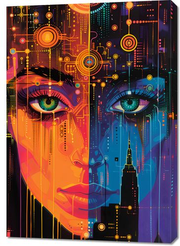 Obraz z serii abstrakcja zatytułowany Cyfrowa Psyche. Przedstawia fascynującą symetrię między ludzką urodą a technologicznym zawirowaniem. Wyraźne, zielone oczy kobiety są centralnym punktem obrazu, ożywione wizją elektronicznych obwodów i cyfrowych sygnałów, które przepływają przez i wokół jej wizerunku. Przecinające twarz linie symbolizują połączenie osobowości z nowoczesnymi technologiami, podczas gdy tło ukazuje zarys charakterystycznego krajobrazu miejskiego. Intensywne, neonowe kolory od pomarańczowego do niebieskiego nadają dziełu dynamiczny i nowoczesny charakter. Obraz ten będzie idealnym dodatkiem do współczesnych biur, salonów gier lub innych przestrzeni kreatywnych, które celebrują połączenie sztuki i technologii.