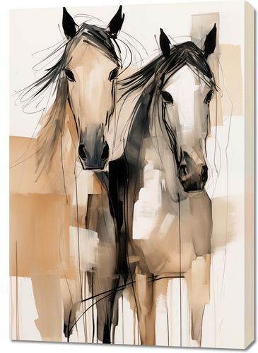 Obraz z serii wnętrza zatytułowany Dusze na Wolności. Ten artystyczny obraz przedstawia dwie abstrakcyjne sylwetki koni, uchwycone w dynamicznych, niemal eterycznych pociągnięciach pędzla. Neutralna paleta barw z dominującymi odcieniami beżu i czerni, podkreślona jest przez akcenty i plamy, co nadaje dziełu głębi i tekstury. Artystyczne, swobodne linie i plamy tuszu tworzą wrażenie ruchu i wolności, wywołując emocjonalne rezonanse z widzem. Obraz jest idealnym wyborem dla miłośników koni, sztuki współczesnej i abstrakcyjnego ekspresjonizmu, będąc nie tylko dekoracją, ale także wyrafinowanym elementem w przestrzeniach takich jak salony, biura, czy galerie sztuki.