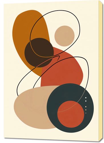 Obraz z serii minimalistyczne zatytułowany Geometria Harmonii. Na tej grafice widzimy grę prostych i zaokrąglonych kształtów splecionych w taniec geometrycznych form. Ciepłe odcienie musztardowego żółcieni, rdzawego pomarańczu, ciemnej czekolady i głębokiego granatu mieszają się, tworząc spójną i przyjemną dla oka paletę. Subtelne linie przewijają się przez kompozycję, dodając lekkości i głębi, a małe kropki akcentują delikatność całości.Ten obraz doskonale odnajdzie się w nowoczesnych i minimalistycznych wnętrzach, gdzie będzie stanowił spokojny, ale interesujący element dekoracyjny. Idealny do salonów, gabinetów czy poczekalni, gdzie może wprowadzić atmosferę wyciszenia oraz estetycznej przyjemności.