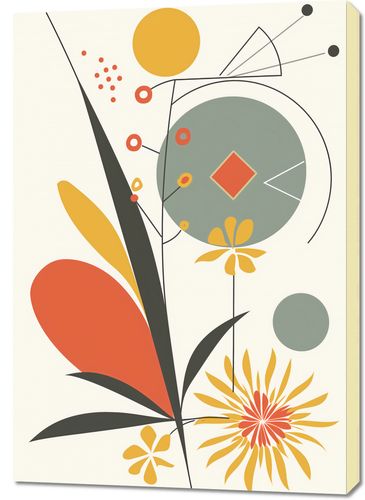 Obraz z serii minimalistyczne zatytułowany Geometryczny Ogród. Obraz ożywia przestrzeń za pomocą zgeometryzowanych motywów przyrody, ukazując śmiałą kompozycję abstrakcyjnych kształtów i organicznych form. Centralne miejsce zajmuje wielowarstwowy obraz geometrycznych kwiatów i liści w ciepłej palecie barw – od żółci, przez pomarańcz, aż po głęboką czerń. Kompozycję uzupełniają finezyjnie rozrzucone kropki i linie, tworzące wrażenie poruszającej się, pulsującej natury zamkniętej w krystalicznych strukturach.Obraz ten będzie doskonałym dodatkiem do nowoczesnych wnętrz, takich jak minimalistyczne salony, biura ze stonowanym wystrojem, czy przestronne hole. Jego spokojne kolory i geometryczne motywy wprowadzą harmonię i artystyczny akcent w każdej przestrzeni, zachowując przy tym subtelność i elegancję.