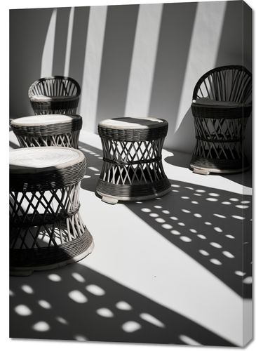 Obraz z serii wnętrza zatytułowany Gra Świateł to stylowa, monochromatyczna fotografia, która oddaje estetykę współczesnego designu. Na fotografii widzimy zestaw eleganckich, plecionych stołków z rattanu ustawionych na tle geometrycznych cieni. Ostre linie cieni przełamują okrągłe kształty mebli, tworząc fascynującą kompozycję pełną kontrastów. Białe siedziska stołków pięknie kontrastują z ciemniejszymi elementami, a gra światła i cienia nadaje scenie trójwymiarowość i teksturę. Obraz ten będzie doskonały dla miłośników minimalistycznych wnętrz, a także dla osób poszukujących elementu dekoracyjnego, który wprowadzi do pomieszczenia nowoczesny i artystyczny akcent. Idealny do nowoczesnych przestrzeni mieszkalnych, biur, kawiarni lub galerii sztuki.