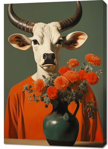 Obraz z serii wnętrza zatytułowany Harmonia Kontrastów. Byk o majestatycznym wyglądzie z intensywnym spojrzeniem, podkreślany przez imponujące rogi i białą sierść, staje w kontraście z delikatnością kwiatów pomarańczowych, które zdobią jego otoczenie. Pomarańczowa tunika, którą nosi, łączy się z barwą kwiatów, tworząc jednolitą paletę barw. Te zaskakujące połączenie elementów dodaje obrazowi nuty fantazji i oryginalności. Idealnie wpisuje się w nowoczesne wnętrza oraz galerie sztuki, gdzie ekscentryczność i kreatywność są na pierwszym planie.