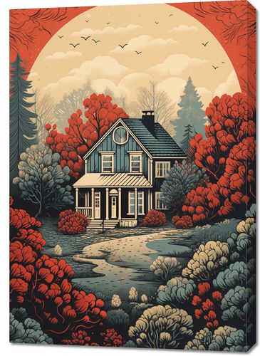 Obraz z serii wnętrza zatytułowany Idylla Rustykalna. Ten ciepły i urokliwy obraz przedstawia sielski dom otoczony przez bujny krajobraz w odcieniach czerwieni i pomarańczy, których intensywność podkreśla zachodzące słońce w tle. Kompozycja łączy w sobie elementy klasycznego amerykańskiego krajobrazu z nostalgicznym uczuciem, które przywodzi na myśl długie, leniwe popołudnia na wsi. Ilustracja ta idealnie nadaje się do nadania charakteru i ciepła każdemu wnętrzu, doskonale pasując do przestrzeni mieszkalnych, kawiarni lub pensjonatów, które chcą zaakcentować swoje powiązania z naturą i wiejskim spokojem.
