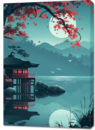 Obraz z serii motywy wschodnie zatytułowany Japoński Pawilon. Ten obraz emanuje spokojem dzięki scenie przedstawiającej tradycyjny japoński pawilon, otoczony przez wodę i delikatnie pochylające się czerwone liście klonu. Ciepłe światło wschodzącego księżyca i subtelne odbicie w wodzie podkreślają atmosferę ciszy i refleksji. Delikatne sylwetki przelatujących ptaków dodają element życia i ruchu. Obraz ten idealnie wpisuje się w przestrzenie współczesne, minimalistyczne, a także te, które celebrują naturę i spokój, takie jak pokoje do medytacji, jadalnie, czy też poczekalnie w spa.