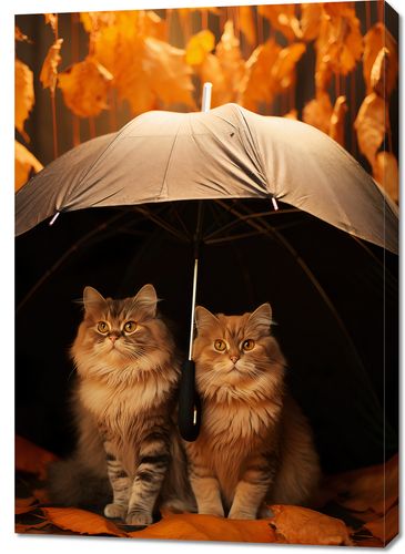 Obraz z serii wnętrza zatytułowany Jesienny Koci Schron prezentuje urocze ujęcie dwóch długowłosych kotów, które znajdują się pod dużym parasolem. Tło kompozycji zdobią spadające złote liście, tworząc ciepłą, jesienią paletę barw. Koty, z hipnotyzującymi oczami, wyglądają na zadumane, a ich puszyste futro w odcieniach brązu i szarości harmonizuje z otoczeniem, dodając obrazowi miękkości i głębi. Ten obraz może stanowić niebanalny element dekoracyjny, wprowadzając do wnętrza poczucie spokoju i urok domowego ciepła, idealny do zawieszenia w salonie lub sypialni dla miłośników kotów i jesiennych motywów.