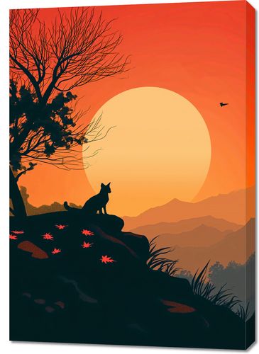 Obraz z serii abstrakcja zatytułowany Kocie Wzgórze ukazuje sylwetkę kota, który usadowił się na wzgórzu, wpatrując się w zachodzące słońce. W tle rozciągają się warstwowe góry, a całość sceny jest nasączona ciepłymi odcieniami pomarańczy i czerwieni, wyrażającymi spokój i harmonię. Drzewo bez liści na pierwszym planie oraz rozsypane po ziemi jesienne liście kontrastują z gładkim tłem, tworząc poczucie głębi i przestrzeni. Ten obraz doskonale oddaje spokojną i refleksyjną atmosferę, idealnie nadając się do pomieszczeń, które cenią sobie ciszę i spokój, takich jak biblioteka, salon, czy miejsce do medytacji.
