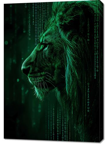Obraz z serii pop art zatytułowany Kod Siły. Prezentuje majestatyczne oblicze lwa zanurzone w cyfrowym kodzie, który spływa w dół jak deszcz binarny, łącząc siłę i surowość natury z precyzją i logiką technologii. Zielonkawe światło podkreśla kontury i muskulaturę króla zwierząt, a cyfrowe elementy otulają jego profil, sugerując połączenie organicznego i syntetycznego świata. Ten obraz idealnie wpisuje się w nowoczesne, technologiczne przestrzenie, takie jak nowoczesne biura, pokoje gamingowe lub innowacyjne przestrzenie edukacyjne, oferując inspirację i refleksję nad współczesnym związkiem człowieka z technologią.