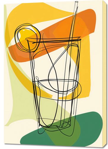 Obraz z serii boho zatytułowany Koktajl Artystyczny to kreatywne połączenie kolorów i linii, które razem tworzą abstrakcyjne przedstawienie szklanki z napojem. Dynamiczne, czarne kontury rysują się swobodnie, sugerując kształt i formę, podczas gdy tło w ciepłych odcieniach żółci i pomarańczy z nutą zieleni dodaje kompozycji letniego klimatu. Ten obraz przyciąga uwagę swoją swobodą formy i świeżością, nadając wnętrzu poczucie radosnej, niezobowiązującej atmosfery. Idealny dla tych, którzy chcą dodać swojemu otoczeniu odrobiny kulinarnego szaleństwa i artystycznego smaku.
