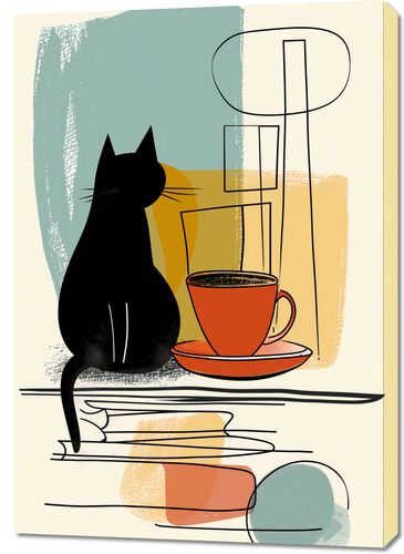 Obraz z serii abstrakcja zatytułowany Kot i Kawa. Ten pełen uroku obraz przedstawia sylwetkę czarnego kota, który wydaje się kontemplować filiżankę kawy. Stylizacja grafiki, z jej czystymi liniami i blokami kolorów w ciepłych odcieniach beżu, ochry oraz stonowanej zieleni i błękitu, tworzy atmosferę spokojnego poranka. Abstrakcyjne elementy w tle, przypominające sztukę modernistyczną, nadają plakatowi współczesnego charakteru. To dzieło sztuki idealnie pasuje do kawiarni, kuchni, a także jako subtelny akcent w nowoczesnym salonie, oferując wizualne wyrażenie komfortu i relaksu.