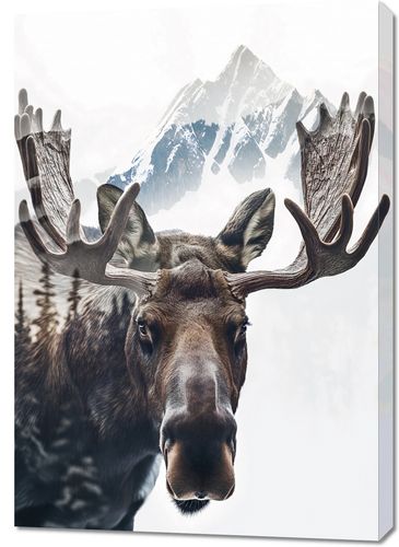 Obraz z serii natura zatytułowany Łoś Duch Lasu to majestatyczne przedstawienie łosia, którego potężne poroże przeobraża się w górski krajobraz. Na pierwszym planie widzimy głęboki, przenikliwy wzrok łosia, skupionego na widzu, z pięknymi, szczegółowo odwzorowanymi detalami sierści. Jego rozłożyste poroże płynnie przeistacza się w ośnieżone szczyty, co symbolizuje jego władzę i jedność z dziką przyrodą. Jasne, lekko zamglone tło sugeruje poranne światło, dodając plakatowi poczucia tajemnicy i dzikiego piękna. Ten obraz doskonale sprawdzi się w przestrzeniach inspirowanych naturą, takich jak chaty górskie, domy myśliwskie, lub jako wyraz głębokiego szacunku dla dzikiej przyrody w salonach i przestrzeniach wspólnych miłośników natury.