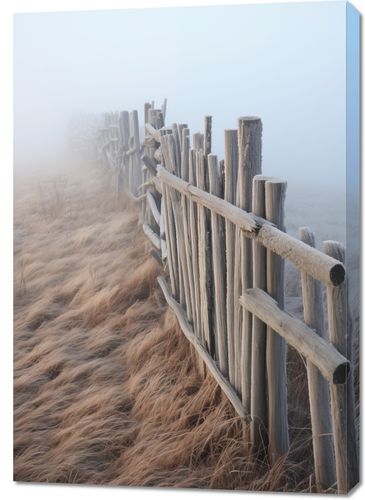 Obraz z serii pejzaże zatytułowany Mgła nad Wydmami. Prezentuje on eteryczny widok na drewniane ogrodzenie, które wiedzie przez poszarpane, suchą trawę wydm. Delikatna mgła otula scenę, nadając jej tajemniczość i spokój, a subtelne odcienie szarości i beżu tworzą uczucie miękkości i ciepła. Ten obraz idealnie oddaje atmosferę wyciszenia i rozmyślania, sprawiając, że jest doskonałym wyborem dla przestrzeni, które mają na celu uspokojenie i relaks, jak spa, pokoje medytacyjne, czy ciche kąciki w domach. To także piękny element dekoracyjny dla wnętrz inspirowanych naturą i spokojem przyrody.
