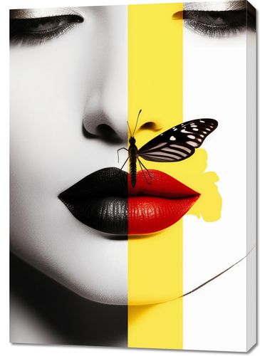 Obraz z serii abstrakcja zatytułowany Motyla Piękność. Ten obraz przedstawia twarz kobiety podzieloną na dwa kontrastujące segmenty: jeden w czerni i bieli, drugi w żywych kolorach z motylem na ustach. Ilustracja eksploruje temat dualizmu natury ludzkiej, piękna i jego zmienności. Obraz ten jest idealnym wyborem dla przestrzeni o współczesnym designie, takich jak salony piękności, studia artystyczne, a także jako wyrazisty element dekoracyjny w nowoczesnych domach.
