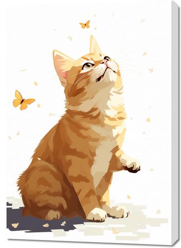 Obraz z serii wnętrza zatytułowany Motyle i Marzenia. Ta pełna ciepła ilustracja przedstawia urocze, rozmarzone spojrzenie kota skierowane na delikatnego motyla. Wielowarstwowe pociągnięcia pędzla i pastelowe kolory tworzą atmosferę beztroski i lekkości. Scena jest przesiąknięta spokojem, a gra światła i cienia nadaje jej głębię i realizm. Ten obraz jest idealnym wyborem dla miłośników kotów i delikatnej, subtelnej sztuki, doskonale nadaje się do wnętrz o domowym charakterze, takich jak salon, pokój dziecka, czy jako uroczy element dekoracyjny w przestrzeniach relaksacyjnych.