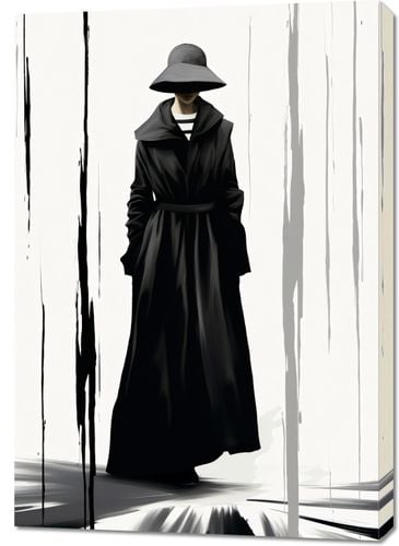 Obraz z serii wnętrza zatytułowany Mroczna Taina. Enigmatyczna postać w czarnym płaszczu i szerokim kapeluszu ukrywa swoją tożsamość, podkreślając aura tajemniczości. Czarno-białe tło z pionowymi smugami przypominającymi deszcz lub płynący atrament dodaje głębi i dramatyzmu kompozycji. Subtelne niuanse światła i cienia grają na powierzchni płaszcza, tworząc atmosferę intrygi i nieokreślonego niebezpieczeństwa. Świetnie sprawdzi się w nowoczesnych galeriach sztuki, luksusowych hotelach o minimalistycznym designie oraz w przestrzeniach przeznaczonych dla miłośników noir i kryminałów.