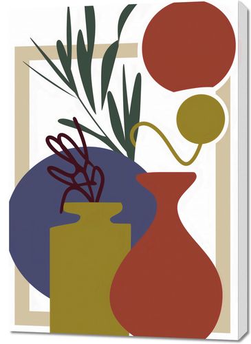 Obraz z serii minimalistyczne zatytułowany Natury Martwe. Ta kompozycja artystyczna zanurza tradycyjny motyw natury martwej w nowoczesnym, geometrycznym stylu. Różnorodne formy waz w żywych kolorach kontrastują z delikatnymi odcieniami zielonych liści, tworząc równowagę między prostotą a bogactwem form. Elementy te łączą się, tworząc elegancką i stylową całość.Ten obraz będzie wyjątkowym dodatkiem do każdego wnętrza, od klasycznie urządzonych po współczesne. Jego stonowane barwy i geometryczne kształty doskonale nadadzą się do przestronnych salonów, jadalni czy nowoczesnych biur. Jest to idealne dzieło dla tych, którzy cenią harmonię i chcą dodać do swojej przestrzeni szczyptę elegancji.