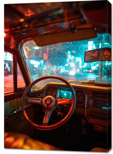 Obraz z serii pop art zatytułowany Nocny Kierowca, przedstawia widok z wnętrza klasycznego samochodu, patrząc przez deszczową, skraplaną szybę na rozświetlone neony miejskiego pejzażu nocą. Ciepłe, czerwone oświetlenie wnętrza samochodu kontrastuje z hipnotyzującym błękitem i elektrycznymi odcieniami świateł zewnętrznych, tworząc intymną, a jednocześnie dynamiczną atmosferę. Kropelki deszczu na szybie dodają tekstury i głębi, sprawiając, że scena jest zarówno realistyczna, jak i liryczna. To dzieło sztuki mogłoby znaleźć swoje miejsce w przestrzeniach nowoczesnych, miejskich loftów lub jako akcent w barze o tematyce retro, wprowadzając element tajemniczości i miejskiego romansu.