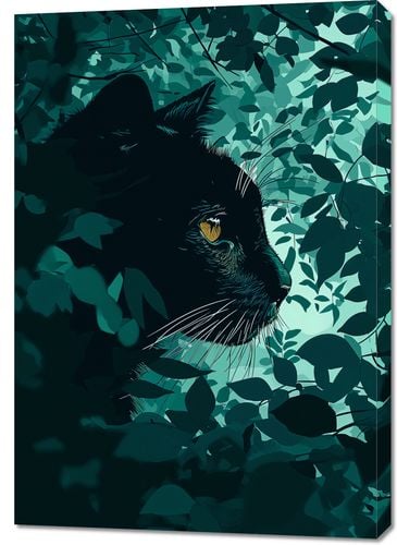 Obraz z serii wnętrza Oczekiwanie, przedstawia portret czarnego kota wtapiającego się w zielone liście. Artysta użył bogatej palety odcieni zieleni, aby stworzyć iluzję kota skrytego w gęstym listowiu, z wyraźnym, żółtym okiem, które przyciąga uwagę i daje wrażenie czujności i tajemniczości. Złożoność wzoru liści kontrastuje z prostotą cienia kota, co nadaje dziełu głębi i wielowymiarowości. Ten obraz byłby idealnym dodatkiem do każdego współczesnego wnętrza, które ceni subtelność i naturę, a także może być interesującym punktem centralnym w galerii sztuki lub przestrzeni wystawienniczej.
