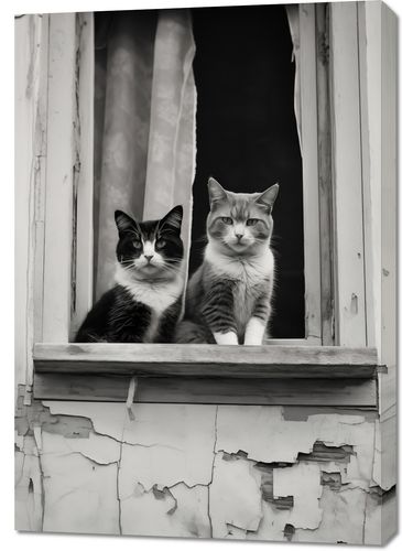 Obraz z serii wnętrza zatytułowany Para w Oknie. Uchwycenie momentu, w którym dwa koty o spokojnych i pełnych godności spojrzeniach pozują w oknie zaniedbanej fasady. Czarno-białe tło fotografii dodatkowo wzmacnia ich wyraziste, charakterystyczne wzory na sierści. Ten obraz to nie tylko urokliwa scena z życia miejskich kotów, ale również piękna metafora o spokoju i zgodzie, jaką można odnaleźć w najprostszych momentach codzienności. Obraz ten będzie wyjątkowym dodatkiem do każdego wnętrza, szczególnie polecany dla miłośników zwierząt i estetyki vintage, a także jako element ozdobny w kawiarniach czy księgarniach, który wnosi element ciepła i domowego klimatu.