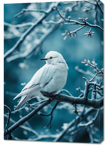 Obraz z serii natura zatytułowany Perłowy Ptak przedstawia urokliwy obraz białego ptaka, który spoczywa na gałęzi drzewa. Ptak, o perłowo białym upierzeniu i przejmujących pomarańczowych oczach, wydaje się być wyizolowany od świata, znajdując ukojenie w zimowej aurze. Tło w chłodnych, niebieskich tonacjach kontrastuje z ciepłym akcentem koloru oczu ptaka, tworząc atmosferę harmonii i spokoju. Delikatne szrony na gałęziach dodają obrazowi delikatności i subtelności, zaś skomponowany w minimalistycznej estetyce, ten plakat jest idealny do wnętrz, które cenią sobie spokój, elegancję oraz kontakt z naturą. Doskonale wpasuje się w przestrzenie takie jak salony relaksacyjne, gabinety terapeutyczne czy nawet jako ukojenie dla oczu w dynamicznie zmieniających się współczesnych biurach.