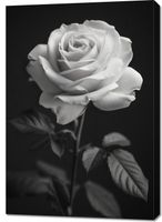 Obraz z serii wnętrza zatytułowany Płatki Róż. Obraz przedstawia ponadczasowy, monochromatyczny obraz róży. Róża, z delikatnymi i szczegółowymi płatkami, jest wyeksponowana na ciemnym tle, co wyostrza jej obrys i podkreśla subtelne niuanse jej formy. Gra światła i cienia nadaje głębi i trójwymiarowości, a ułożenie płatków w pełnym rozkwicie symbolizuje piękno i doskonałość. Liście i łodyga są skromne, ale wyraźne, dodając naturalności całej kompozycji. Obraz oddaje esencję delikatności i elegancji róży, co sprawia, że jest idealny dla każdego, kto szuka elementu dekoracyjnego o subtelnym pięknie i spokojnej, relaksującej estetyce.