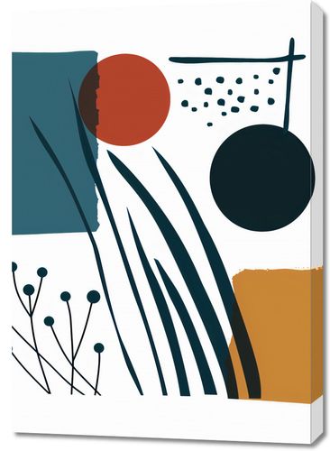 Obraz z serii minimalistyczne zatytułowany Przerys nad Treścią. Obraz przedstawia abstrakcyjną kompozycję geometrycznych kształtów i linii w bogatej palecie barw. Po lewej stronie dominuje duża, teksturalna bryła w kolorze ciemnoturkusowym, która balansuje kompozycję. Po prawej stronie widzimy zestawienie okrągłych form: mniejsza, ciepła pomarańczowa kula nakłada się na większy, głęboki czarny krąg. Pomiędzy nimi rozwijają się liniowe ilustracje roślin, które wydają się tańczyć na wietrze. Tło plakatu jest pastelowym beżem, a delikatne kropki i kreski dodają dynamiki. Ten obraz doskonale wkomponuje się w nowoczesne przestrzenie biurowe, minimalistyczne salony lub stylowe miejskie kawiarnie. Jego spokojne, lecz wyraziste barwy będą idealnie współgrać z czystymi, jasnymi przestrzeniami, oferując jednocześnie subtelny akcent kolorystyczny.