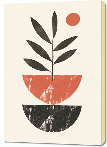Obraz z serii boho zatytułowany Roślinna Sztuka.Ta grafika, z jej uproszczoną, ale wyrafinowaną kompozycją, prezentuje stylizowaną roślinę wyrastającą z półkolistej, czerwonej doniczki, na tle czarno-białej, teksturalnej formy. Mały, pomarańczowy kształt nad rośliną dodaje subtelnej równowagi i może symbolizować słońce albo owoc, który nadaje życie. Dzieło, z jego zredukowaną paletą barw i silnymi liniami, tworzy wyraźny, graficzny obraz. To dzieło doskonale uzupełni przestrzeń, która ceni sobie prostotę, naturę i czystą formę, idealnie nadaje się do wnętrz w stylu minimalistycznym, skandynawskim, czy współczesnym, wprowadzając element harmonii i spokojnej estetyki.
