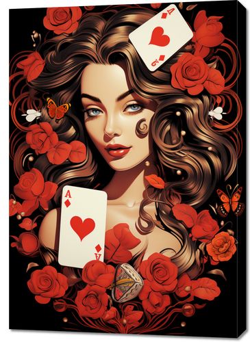 Obraz z serii abstrakcja zatytułowany Różany Hazard. Ta bogato zdobiona grafika przedstawia portret kobiety z królewskim spokojem, otoczoną przez wirujące karty z sercami i rozkwitające czerwone róże. Jej włosy płynnie przechodzą w kwiatowe motywy, a spojrzenie jest pełne tajemnicy i uroku. Motyle i drobne perełki dodają kompozycji element fantazji i delikatności. Wszystko to na tle głębokiej czerni, która eksponuje intensywność kolorów i detali. Obraz ten jest idealny dla przestrzeni, które chcą dodać element romantyzmu i wyrafinowania, jak eleganckie sypialnie, prywatne kolekcje czy luksusowe salony. Jego barwna paleta i symboliczne elementy sprawiają, że jest to dzieło, które przyciąga wzrok i pobudza wyobraźnię. BLEJTRAMABlejtrama, na którą naciągane jest płótno, wykonana jest z naturalnego drewna sosnowego. To mocne i solidne drewno stanowi jedno z najbardziej ekologicznych rozwiązań, gdyż jest łatwe w obróbce. Dodatkowym atutem jest fakt, że sosna rośnie w Polsce, co gwarantuje lokalną obróbkę materiału. Obraz na takiej blejtramie jest trwały i wytrzymały. Ramki do zdjęć nie są wliczone w cenę wydruku. Jeśli chcesz je nabyć, prosimy o dokonanie zakupu oddzielnie.ZADRUKOWANE BOKIKażdy egzemplarz charakteryzuje się zadrukowanymi bokami, co umożliwia zawieszenie obrazu na ścianie bez potrzeby dodatkowej oprawy.