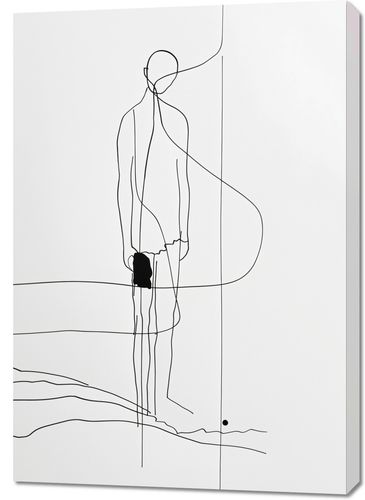 Obraz z serii minimalistyczne zatytułowany Samotna Wędrówka. Obraz przedstawia postać człowieka przedstawionego za pomocą zredukowanych linii, która wyraża elegancję i prostotę. Postać z dużym plecakiem jest uchwycona od tyłu, sugerując podróż lub długą wędrówkę. Linie przypominające krajobraz na dole obrazu i pojedynczy czarny punkt mogą symbolizować dalekie cele lub przemyślenia wędrowca. Ten minimalistyczny rysunek wprowadzi do wnętrza atmosferę refleksji i poszukiwania, będąc doskonałym wyborem do przestrzeni, które inspirują do myślenia i odkrywania, takich jak gabinety, studia czy nawet miejsca publiczne, gdzie sztuka ma za zadanie pobudzać do przemyśleń.