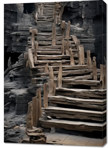 Obraz z serii pejzaże zatytułowany Schody do Nieznanego. Ten tajemniczy i intrygujący obraz przedstawia prymitywne, drewniane schody prowadzące w górę przez strukturę przypominającą starożytną ruiny lub naturalne formacje skalne. Zanurzone w półmroku, schody te wydają się zapraszać odkrywców do podjęcia podróży w nieznane, pełnej nieoczekiwanych odkryć. Obraz ten idealnie oddaje uczucie odkrycia i przygody, idealny dla przestrzeni zainspirowanych historią, naturą, czy literaturą eksploracyjną. Może stanowić inspirujący element w domach, biurach, a także w przestrzeniach publicznych takich jak kawiarnie tematyczne lub księgarnie.