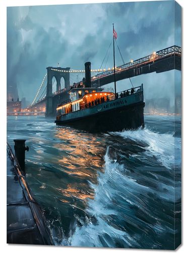 Obraz z serii abstrakcja zatytułowany Stary Parowiec uchwycił nostalgiczny obraz starego parowca przemierzającego wody przy mrocznym niebie, z tłem rozświetlonego mostu. Światła na parowcu rzucają ciepły blask na fale, tworząc złoty refleks na powierzchni wody, co kontrastuje z chłodnymi odcieniami burzowych chmur i zmierzchu. To malownicze przedstawienie, połączone z dynamiczną grą świateł i cieni, tworzy romantyczną i pełną atmosfery scenę, która przyciąga oko i wywołuje uczucie sentymentu do dawnych czasów. Idealnie nadaje się do zawieszenia w przestrzeniach, gdzie chcemy dodać element historycznej elegancji i marzycielskiego nastroju, takich jak biblioteki, studia, a nawet salony.